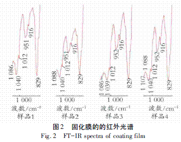 (1)紅外光譜測(cè)試樣品制備:直接用環(huán)氧乳液與固化劑按照表4比例制備樣品,攪拌均勻后,放置15~20min進(jìn)行熟化,然后在氯化鈉晶片上涂上薄薄的一層,固化完成后放在干燥器內(nèi)干燥24h以上待用。