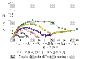 圖8為m(環(huán)氧乳液)∶m(固化劑)=4.5∶1時(shí),不同浸泡時(shí)間下的奈奎斯特圖。