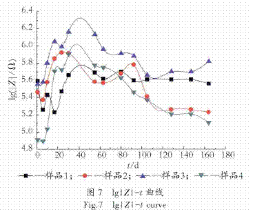 圖7是不同固化劑用量下,|Z|0.01(頻率為0.01Hz時(shí)的交流阻抗值)隨時(shí)間變化曲線。