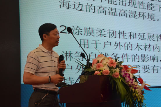 來自北京化工大學同時又是中國水性木器涂料產(chǎn)業(yè)聯(lián)盟專家委員會主任的何立凡教授帶來了《高性能戶外水性木器漆研制及應用》的報告。戶外家具包括門窗、欄桿、桌椅、棧道等木結(jié)構(gòu)材料,范圍十分廣泛,因為在室外,故而對耐水性、耐候性有較高的要求。何教授認為,選用耐候性優(yōu)異的樹脂體系、設(shè)計合理的粒子結(jié)構(gòu)、采用反應適中的交聯(lián)單體、配合多效的助劑、建立完整的涂裝體系,就能夠得到優(yōu)異的水性木器涂料,成功應用在戶外家具上。