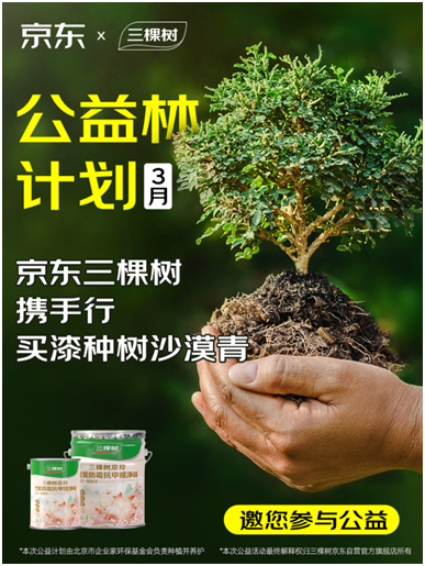 伴隨新品上市,延續(xù)三棵樹(shù)“健康+自然”的品牌基因,三棵樹(shù)與京東聯(lián)合啟動(dòng)"買(mǎi)一漆種一樹(shù)":3月活動(dòng)期間,每新增一位JC乳膠漆系列購(gòu)買(mǎi)用戶,品牌將在內(nèi)蒙古阿拉善荒漠化地區(qū)種植一棵樹(shù)。