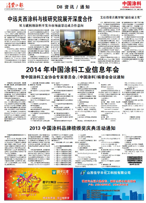 中國(guó)涂料報(bào) 2014年8月14日 星期四